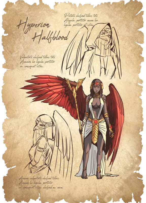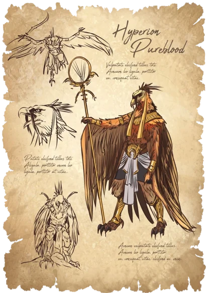 Their senses are exceptionally sharp, with eyesight rivalling that of the keenest birds of prey and auditory senses far exceeding human capabilities. This predatory perception enables Hyperions to detect the subtlest movements and sounds, granting them an unparalleled advantage in both hunting and combat. Hyperions are also graced with fully functional phoenix-like wings, granting them remarkable agility and the gift of flight. Despite their bones being less dense than those of humans, they maintain equivalent strength, allowing for powerful aerial maneuvers and swift movements.
